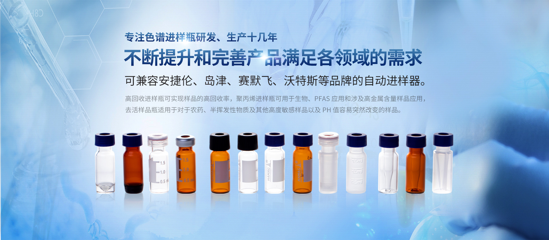 浙江哈邁科技有限公司(簡稱HAMAG),成立于2005年,總部位于美麗的海濱城市寧波,是中國優(yōu)質(zhì)色譜進樣瓶、樣品瓶供應(yīng)商,是一家專業(yè)從事色譜耗材的科研、設(shè)計、生產(chǎn)、銷售和系統(tǒng)集成為一體的生產(chǎn)型企業(yè)。經(jīng)過十幾年的研發(fā)與努力,通過和國內(nèi)外多個科研部門,浙江大學(xué)理工學(xué)院,同時與品牌:安捷倫、沃特世、島津等公司的技術(shù)交流與學(xué)習(xí),我們成功的研制開發(fā)出實驗室分析設(shè)備專用的各種型號的自動進樣瓶、頂空瓶及其配套蓋墊;特氟龍與硅膠復(fù)合墊片;特氟龍/硅膠制品;創(chuàng)新型固相萃取儀;針式過濾器等幾十種實驗室耗材及關(guān)聯(lián)產(chǎn)品...